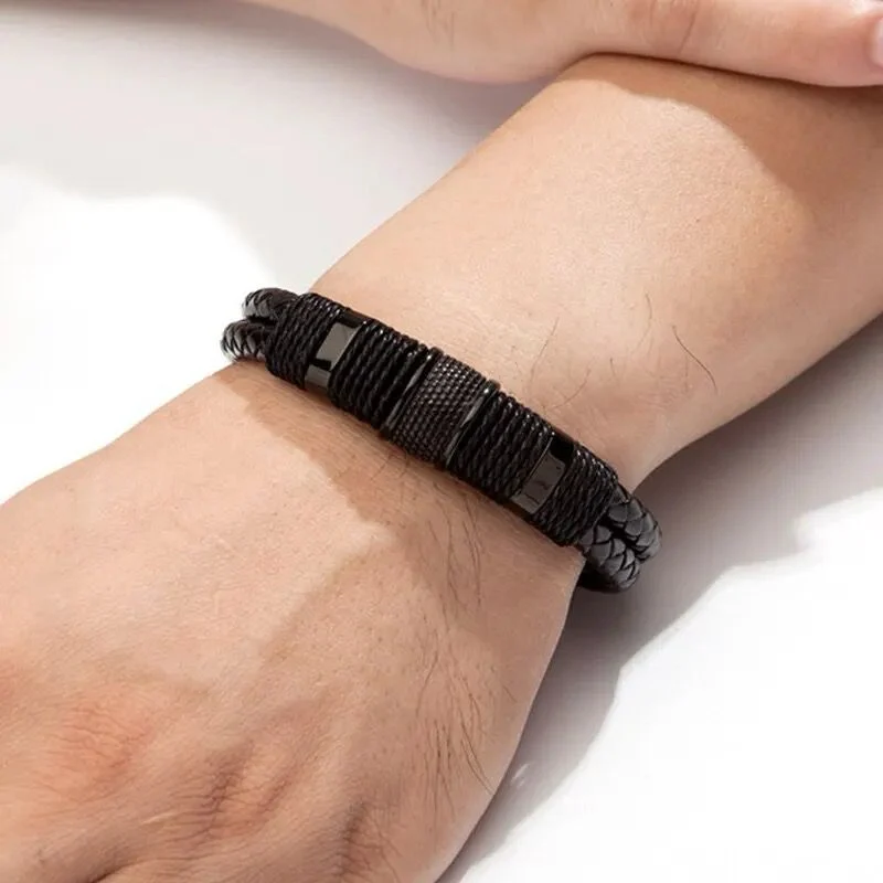 Pulsera Negra JOY-5 Hombre Cuero y Acero