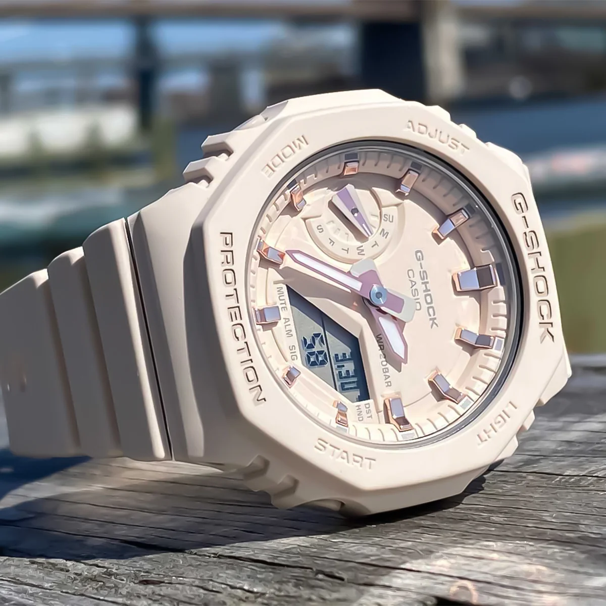 El G-Shock GMA-S2100-4A es mucho más que un reloj. Diseñado para quienes buscan un equilibrio entre estilo, funcionalidad y resistencia, este modelo compacto con diseño minimalista y delgado destaca por su versatilidad y estética moderna. Inspirado en la icónica serie GA-2100, el GMA-S2100-4A ofrece una estructura duradera con una apariencia refinada en color rosa mate, ideal para el uso diario y para acompañarte en cualquier aventura.