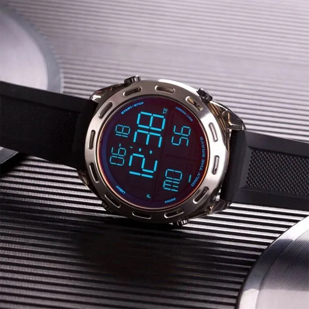 Equipado con movimiento japonés de cuarzo digital, integra cronómetro, cuenta atrás, alarma, calendario, hora dual y luz LED para ofrecer control total del tiempo en cualquier entorno. Su resistencia al agua de 50 metros, cristal mineral y correa de silicona negra con cierre de hebilla consolidan una propuesta práctica, durable y lista para el uso diario activo.