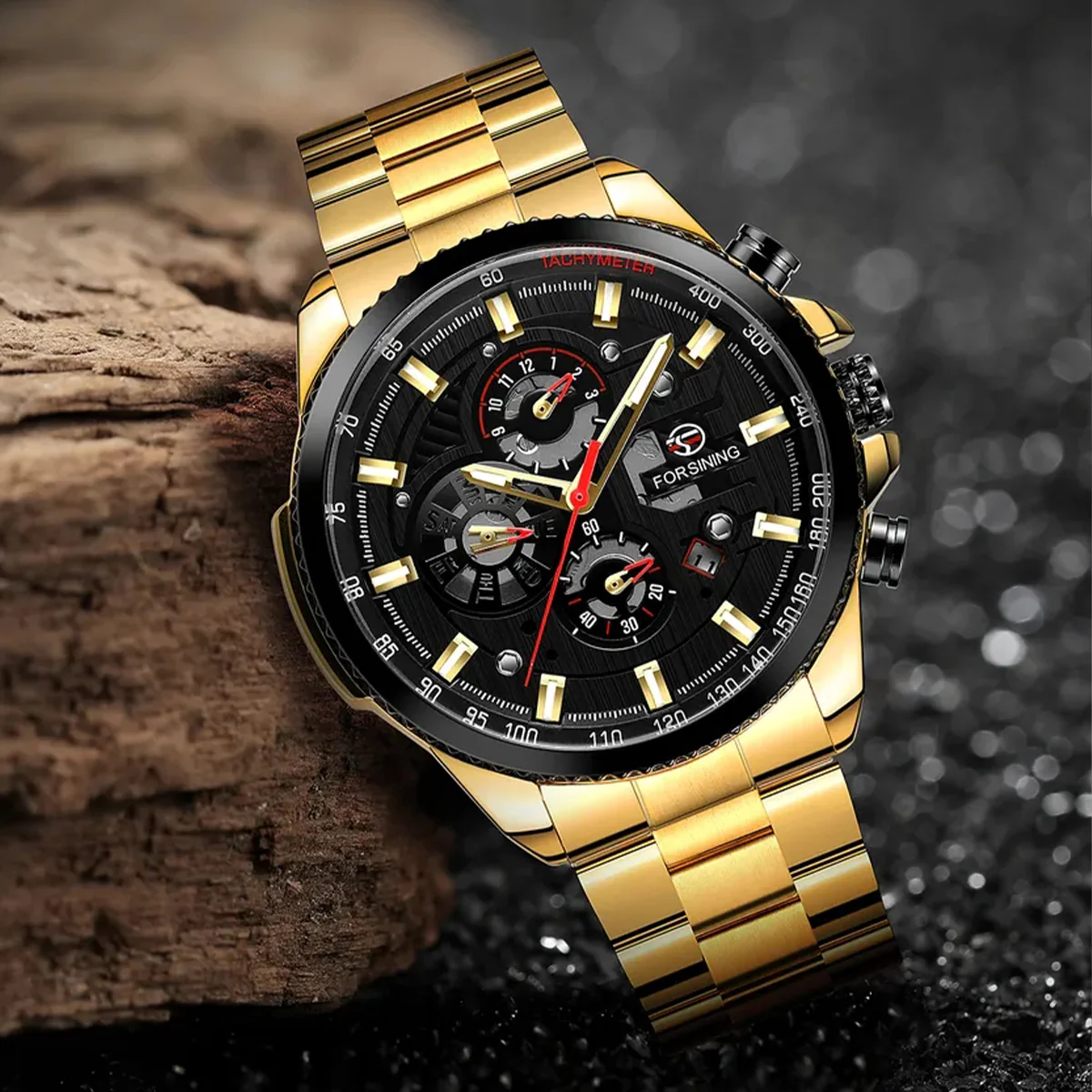 El Forsining (FOR-8) es un reloj que combina la potencia visual de un diseño deportivo, la elegancia del acero inoxidable dorado y la ingeniería de un movimiento mecánico automático.