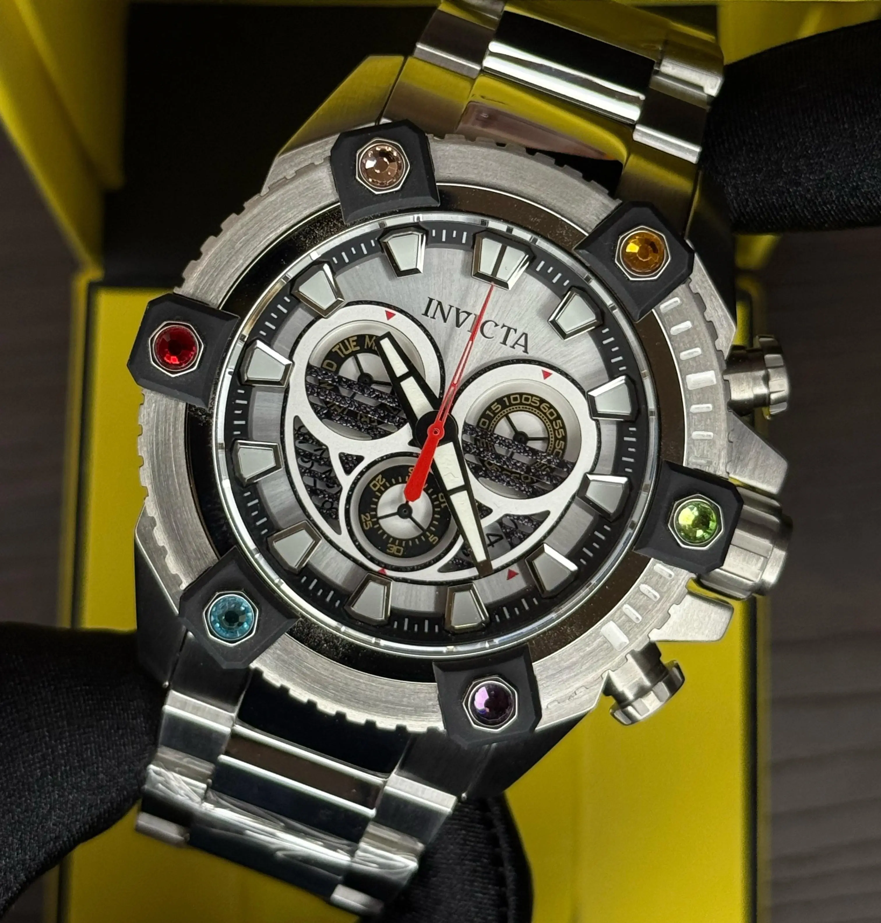 El Invicta COALITION FORCE 46658 es un reloj de cuarzo para hombre. Material de acero inoxidable y resistente al agua hasta 200 metros. Un reloj caracterizado por su diseño exclusivo que cuenta con 6 piedras multicolor.