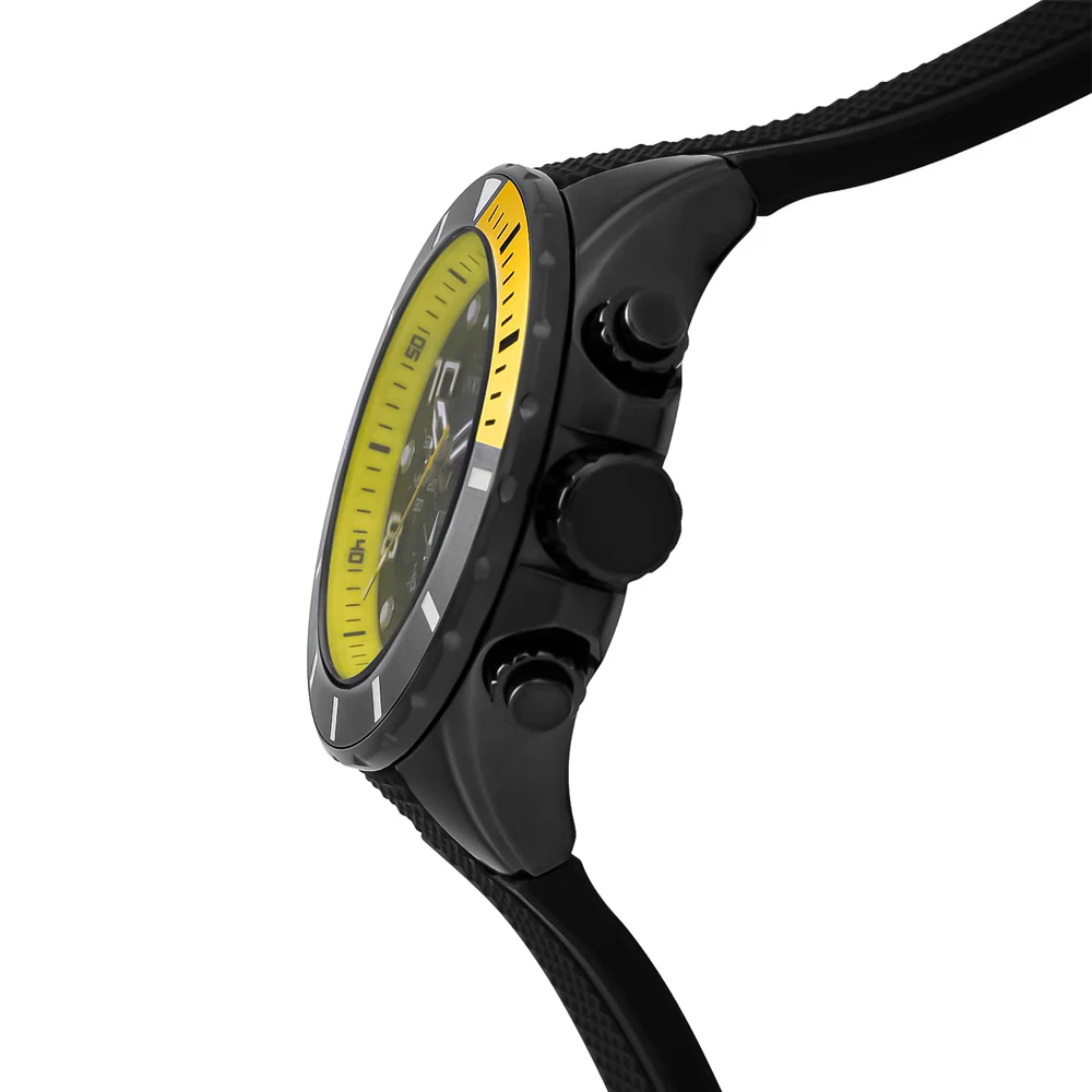 - Diseño impactante y deportivo: contraste visual entre negro profundo, detalles amarillos y plateados, asas robustas y esfera legible con subesferas que aportan funcionalidad.