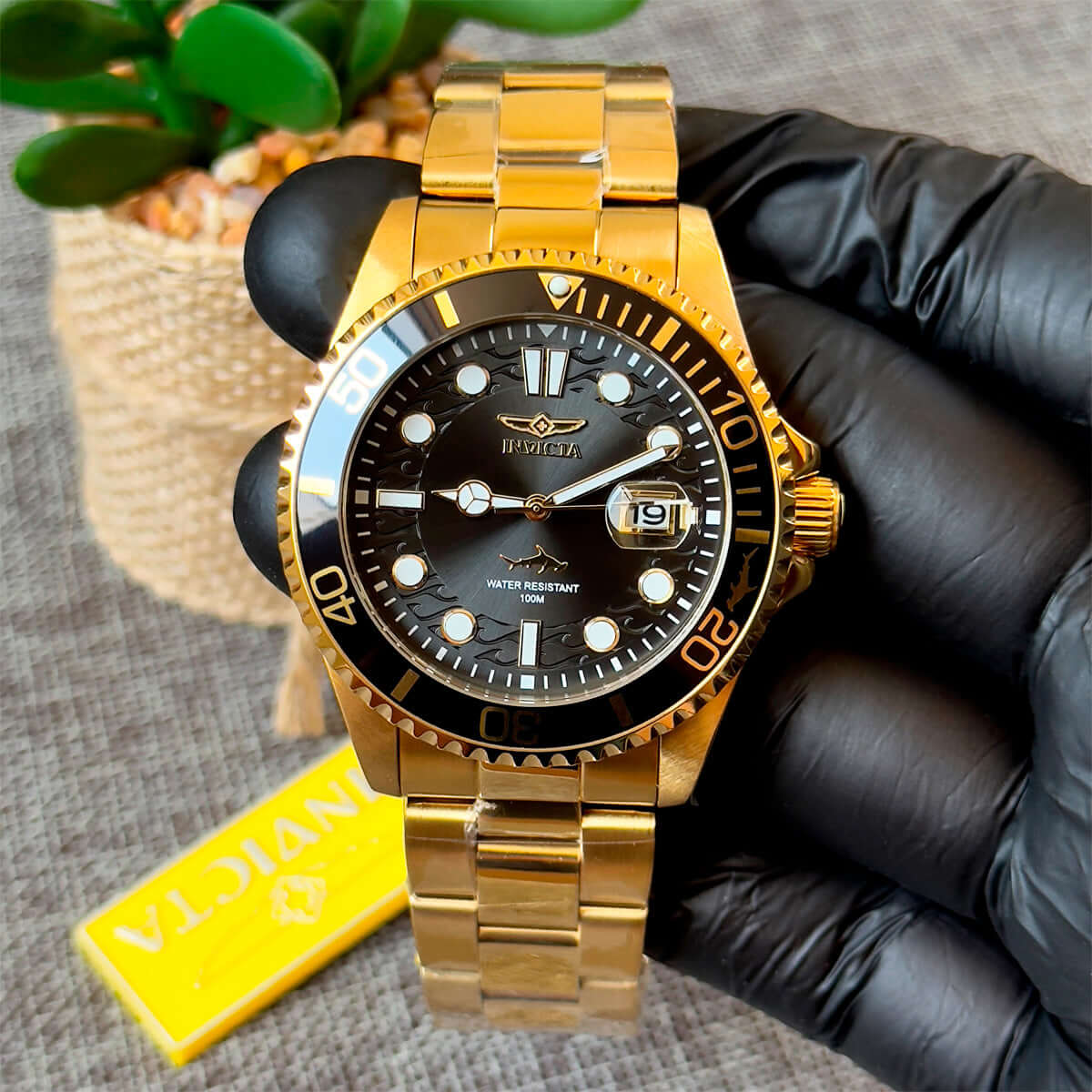 El Invicta Pro Diver 30026 se erige como un compendio de elegancia y funcionalidad a la vez que añade un diseño robusto que a su vez resulta ser sofisticado. Su acabado dorado y acabados en bisel negro hacen de este modelo de reloj un complemento llamativo para los que buscan estilo a la vez que resistencia.