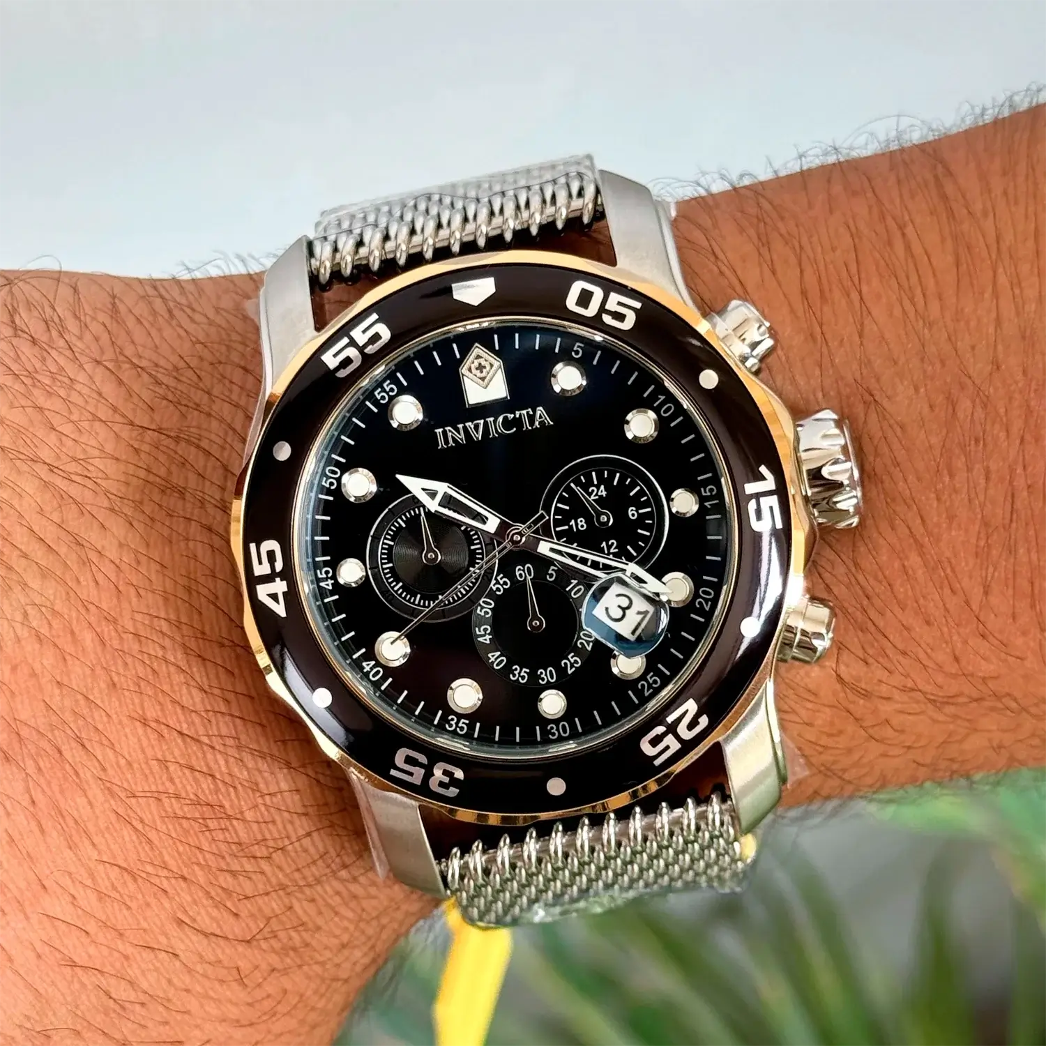 El Invicta Pro Diver 48073 es la encarnación perfecta de robustez, precisión y estética refinada. Con su caja de 48 mm de diámetro en acero inoxidable y un bisel con acentos metálicos en dorado, negro y acero, este modelo transmite poder, elegancia y funcionalidad desde el primer vistazo.