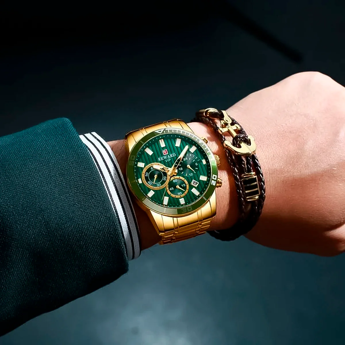 Reloj Reward Dorado con Verde REW-1 de moda con correa de acero, 100% original de fábrica, garantía 1 año, el acompañante perfecto para el hombre actual.